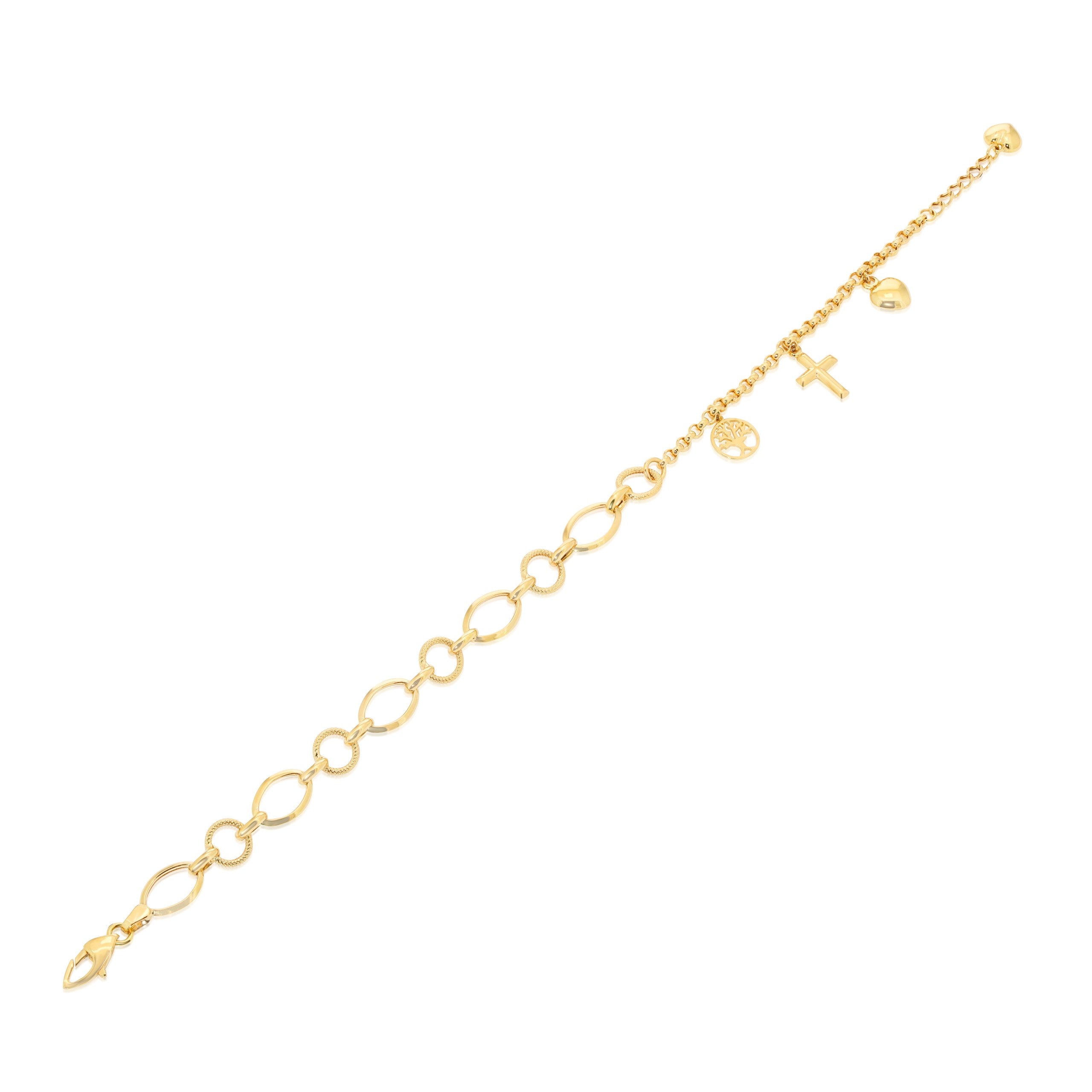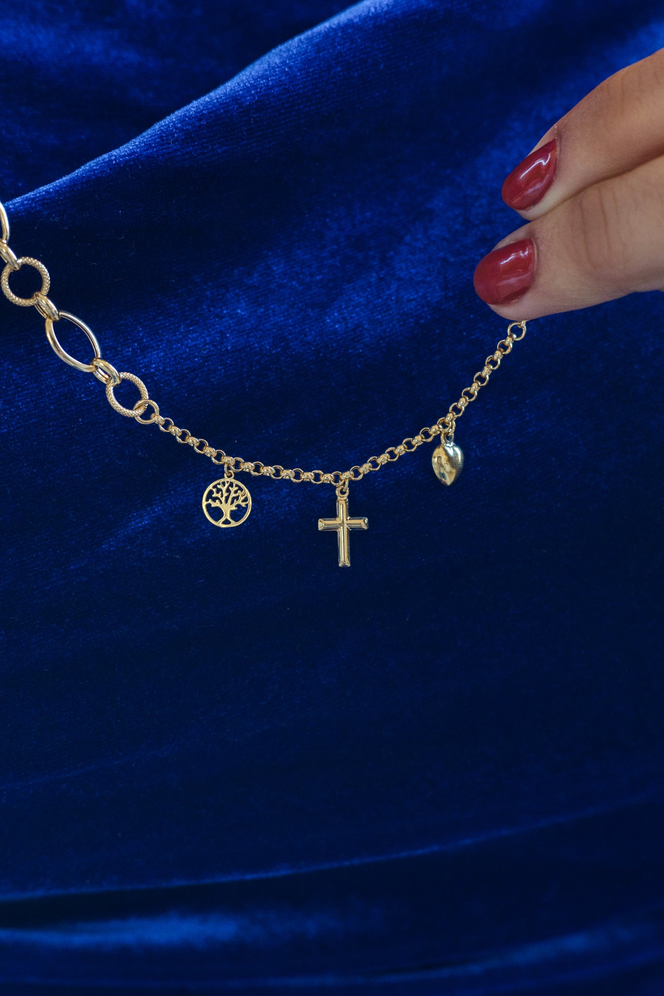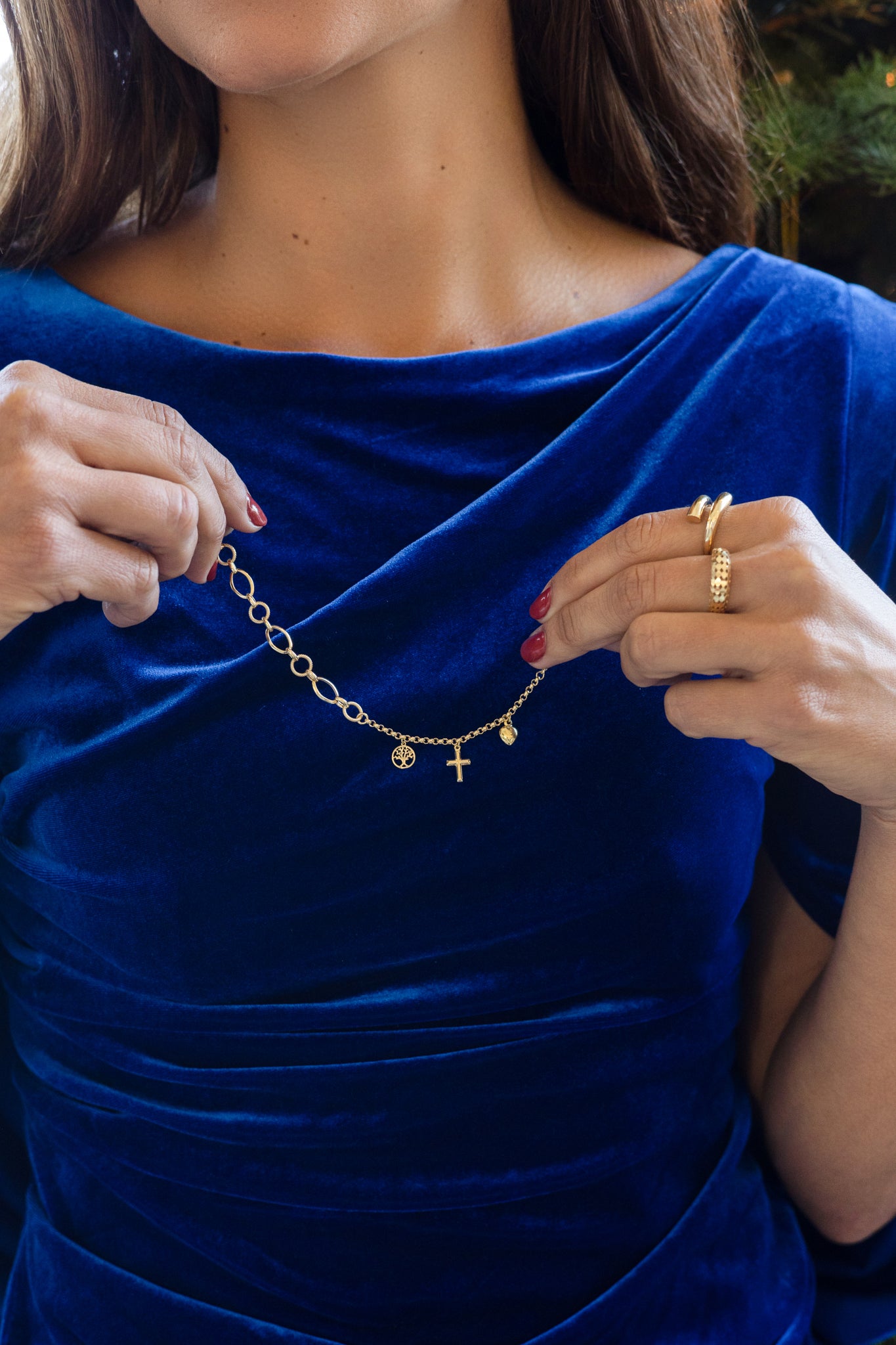 Striking, meaningful, and effortlessly chic, the Mixed-Link Charm Bracelet in 18k Yellow Gold unites bold design with heartfelt symbolism. One half shines with polished oval links alternating with matte-textured circles, while the other half transitions into a classic Portuguese chain adorned by three petite charms—a Tree of Life, a tiny cross, and a heart—celebrating growth, faith, and love in perfect harmony.