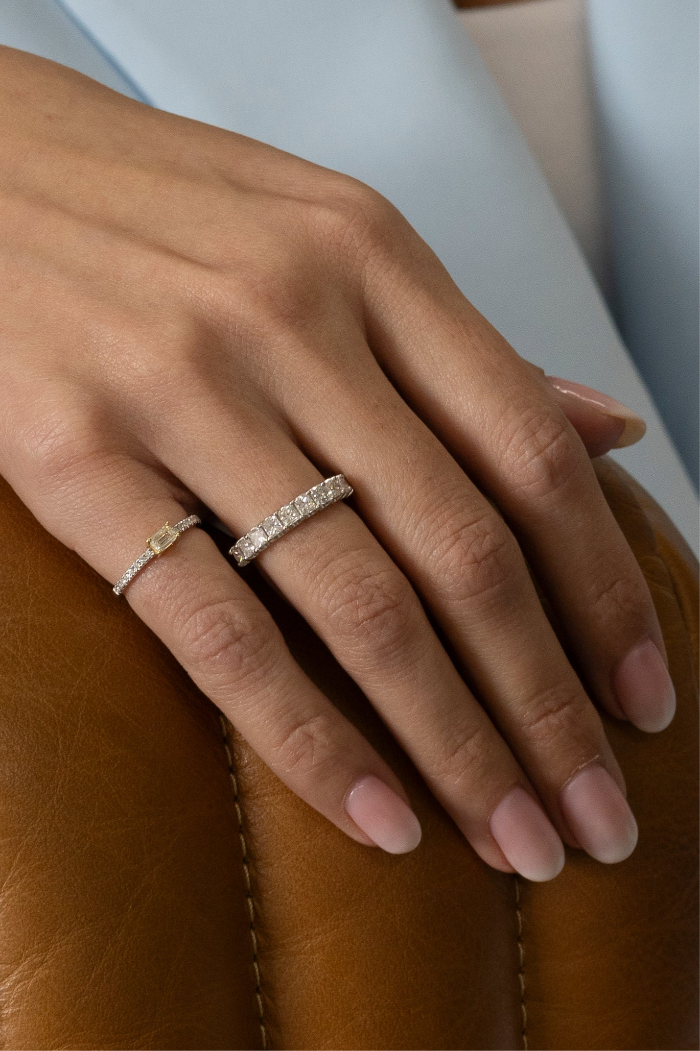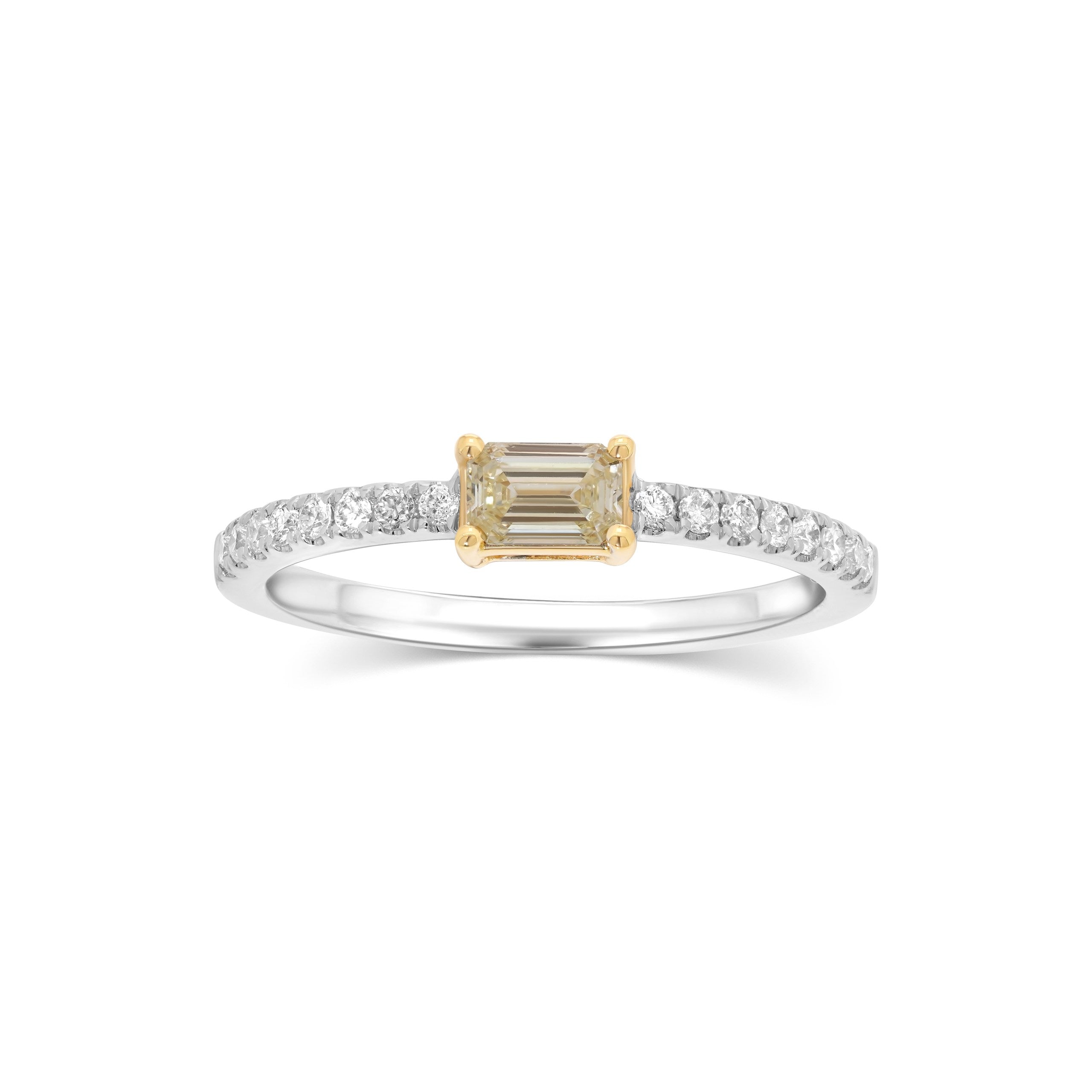 Modern elegance meets timeless sophistication in this Two-Tone Emerald-Cut Diamond Ring. Crafted in a striking combination of 18k white and yellow gold, the design features a sleek emerald-cut diamond at the center—set in a radiant yellow gold frame—surrounded by a brilliant pavé of natural diamonds along the white gold band.