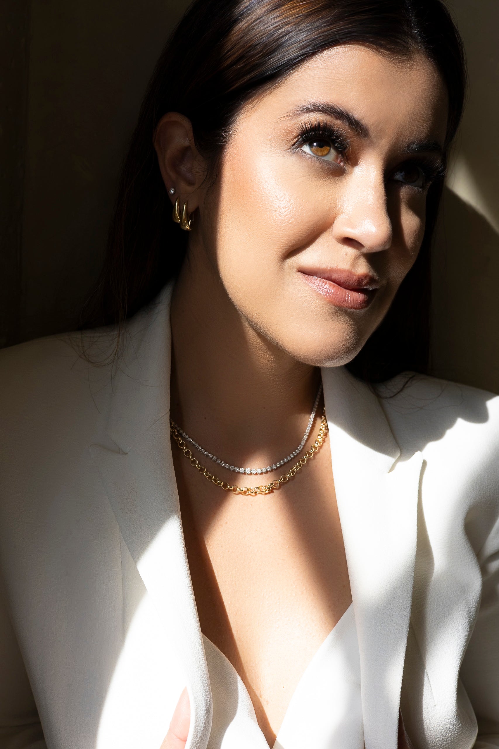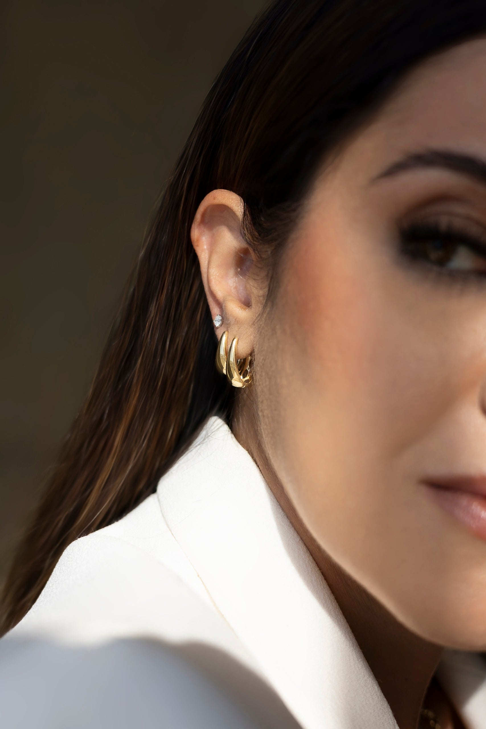 Available in two graceful sizes—approximately 1.7 cm and 1.5 cm—these earrings are designed to be styled either individually or together. For a chic, layered look, we recommend wearing the larger hoop in the first piercing and the smaller in the second, creating a beautifully balanced and contemporary aesthetic, as styled by our model.