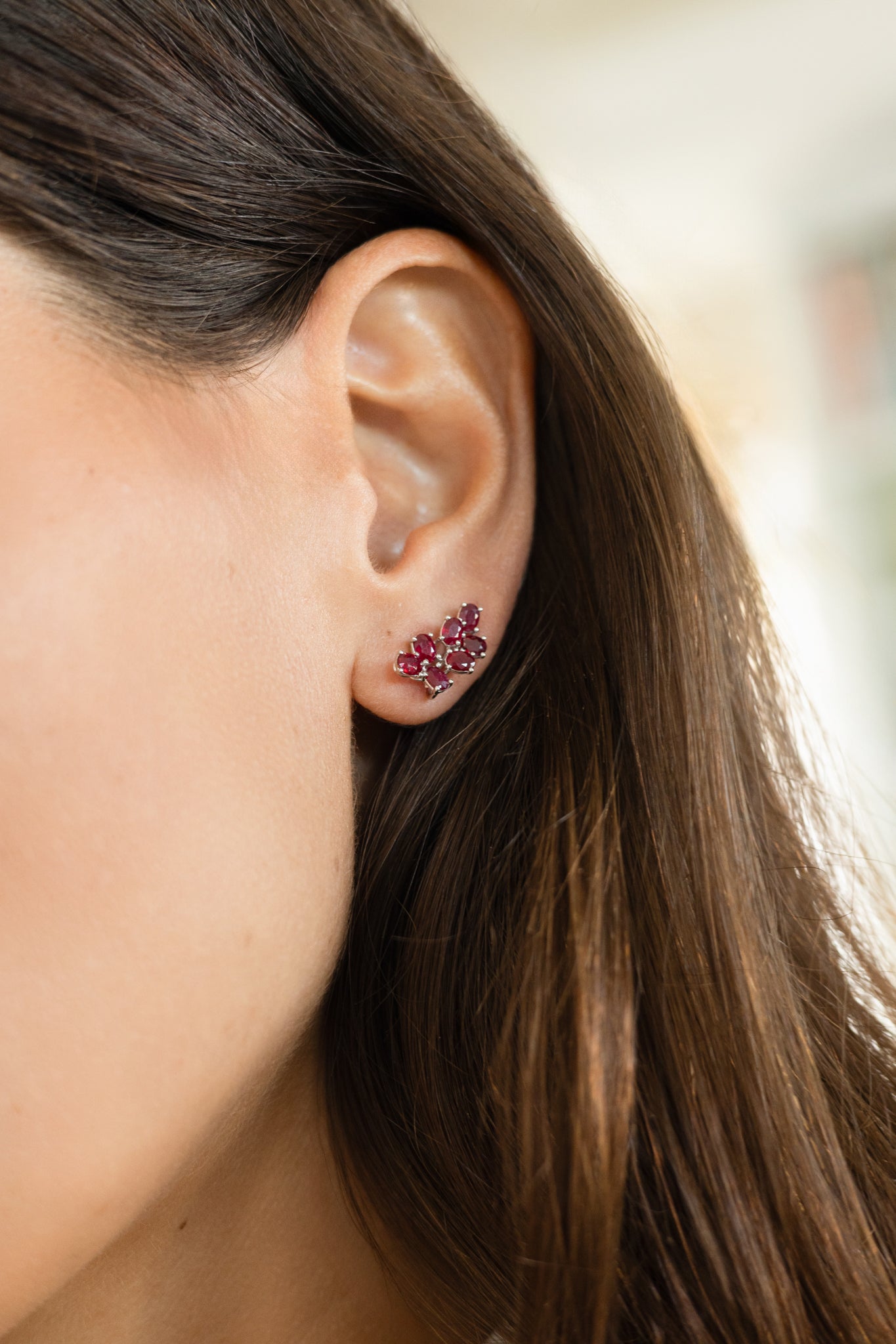 Fierce and feminine, the Ruby Climber Earrings bring passion and elegance to the forefront of modern design. Crafted in luminous 18k white gold, each earring features seven natural oval-shaped rubies arranged in a graceful climbing silhouette that hugs the ear with vibrant color and bold sophistication.
