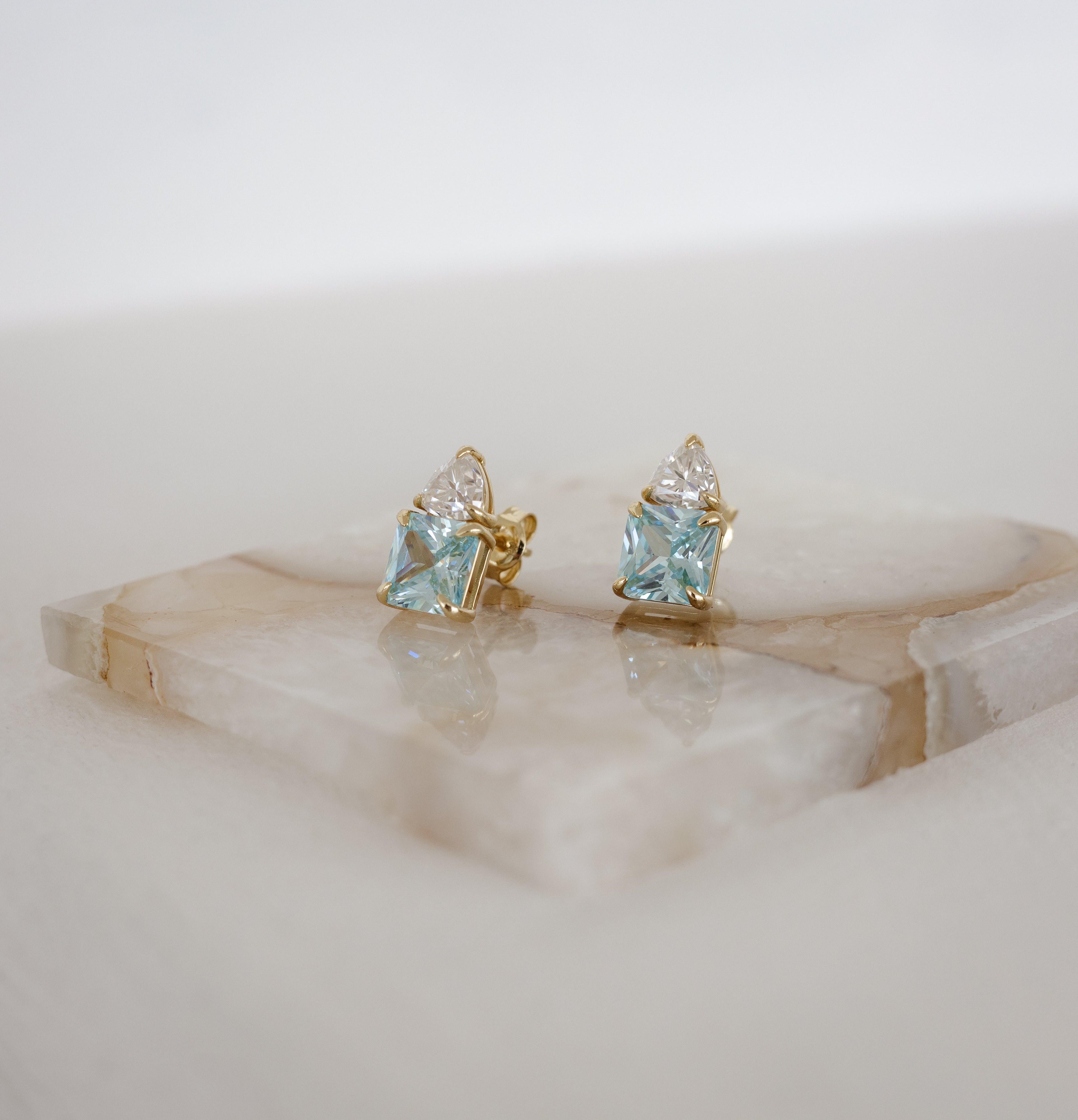 The Lume Earrings features a captivating Aquamarine Zirconia stone and dazzling Moissanite accents. Elegant and versatile, it adds a touch of luxury to any look, bringing personality and sparkle to both everyday moments and special occasions.