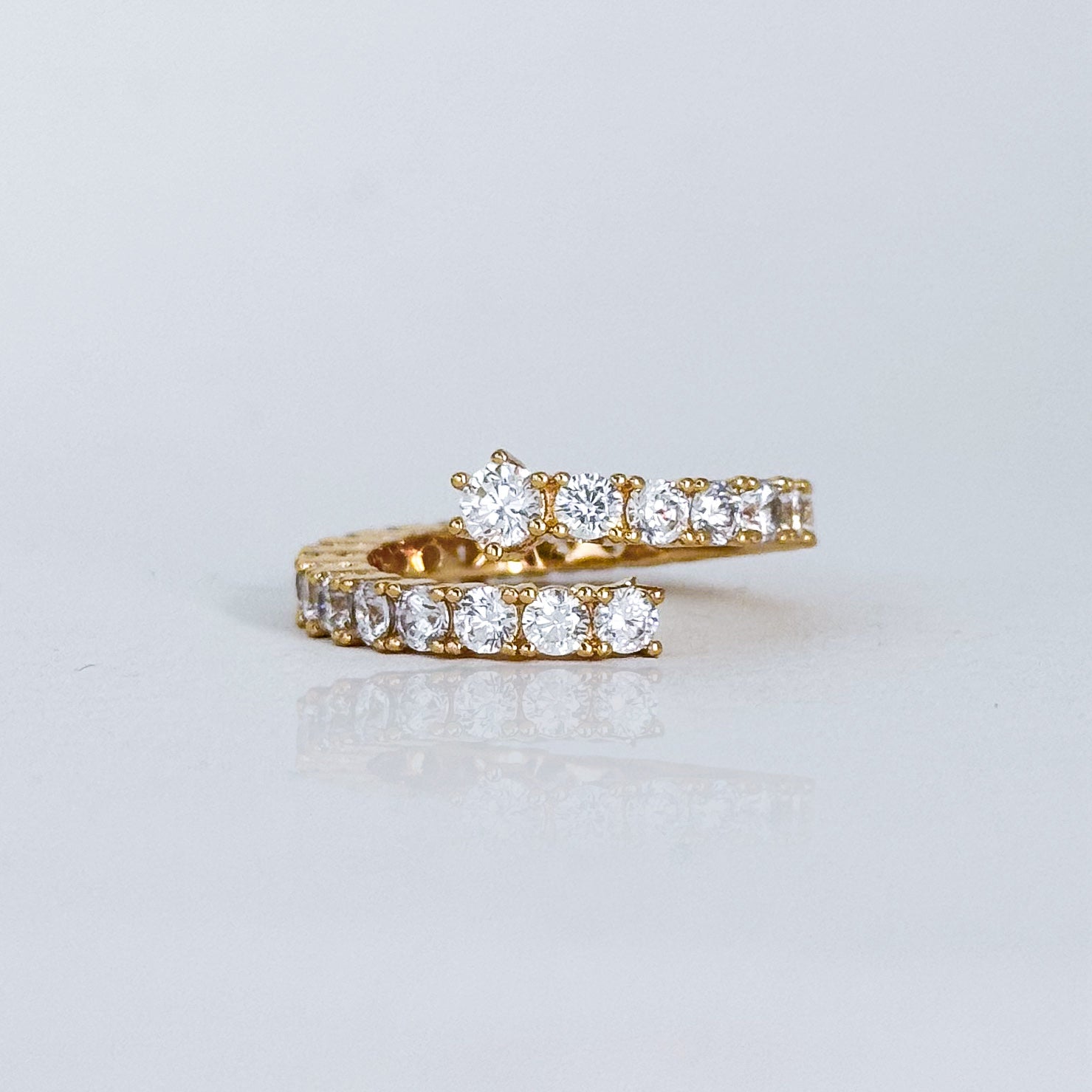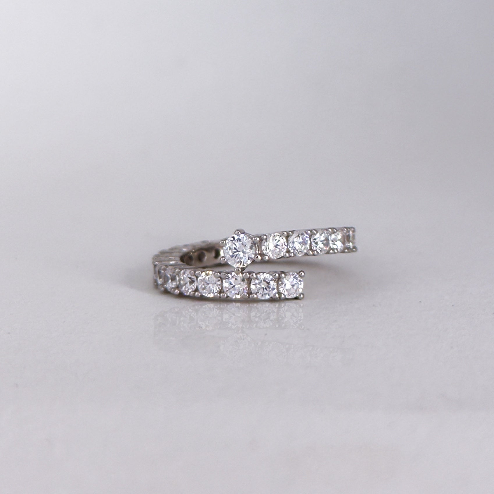This stylish ring boasts an open-ended design adorned with dazzling cubic zirconia stones, ideal for adding a touch of elegance and fashion to any occasion.