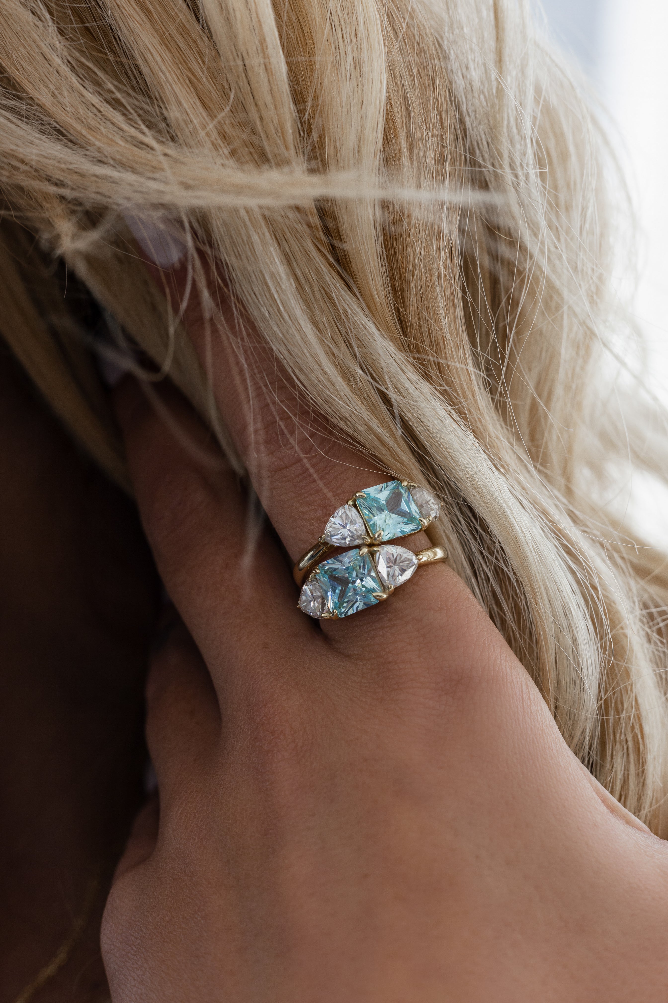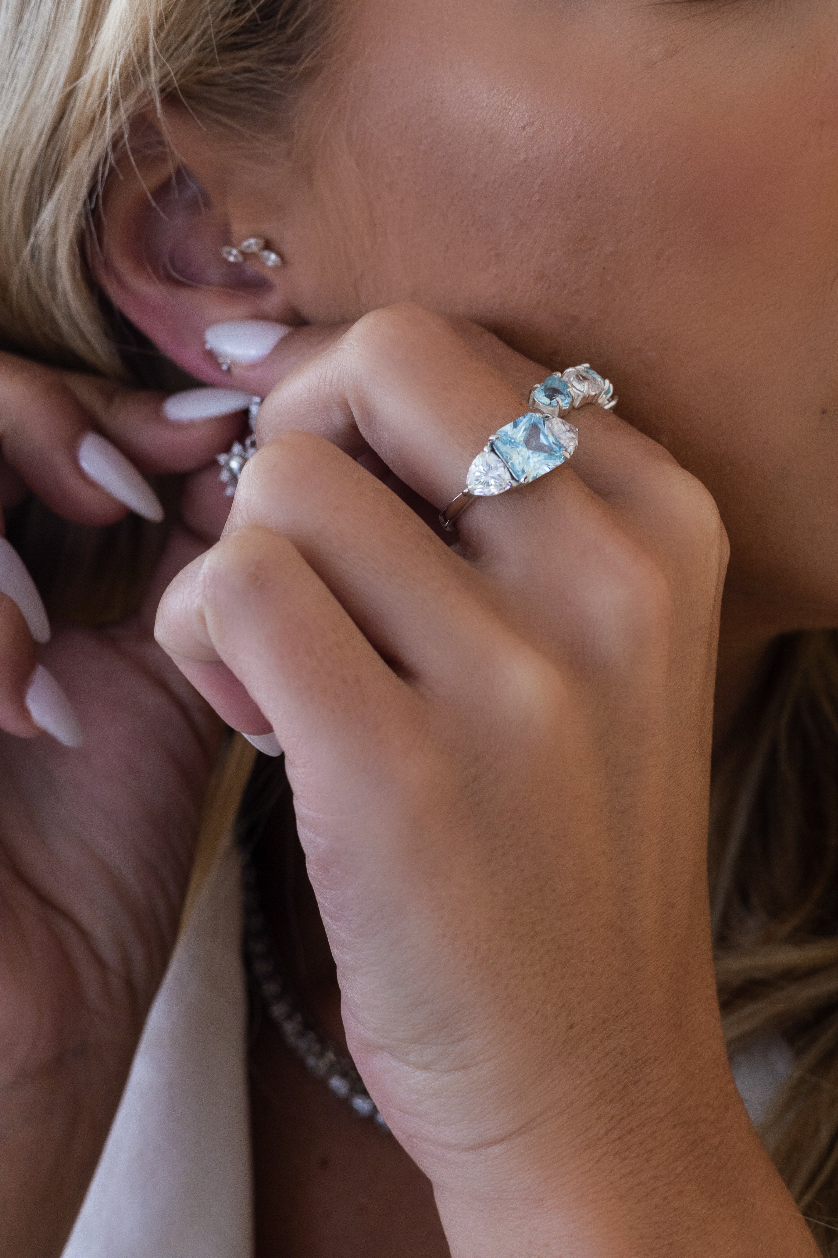 The Lume Ring features a captivating Aquamarine Zirconia stone and dazzling Moissanite accents. Elegant and versatile, it adds a touch of luxury to any look, bringing personality and sparkle to both everyday moments and special occasions.