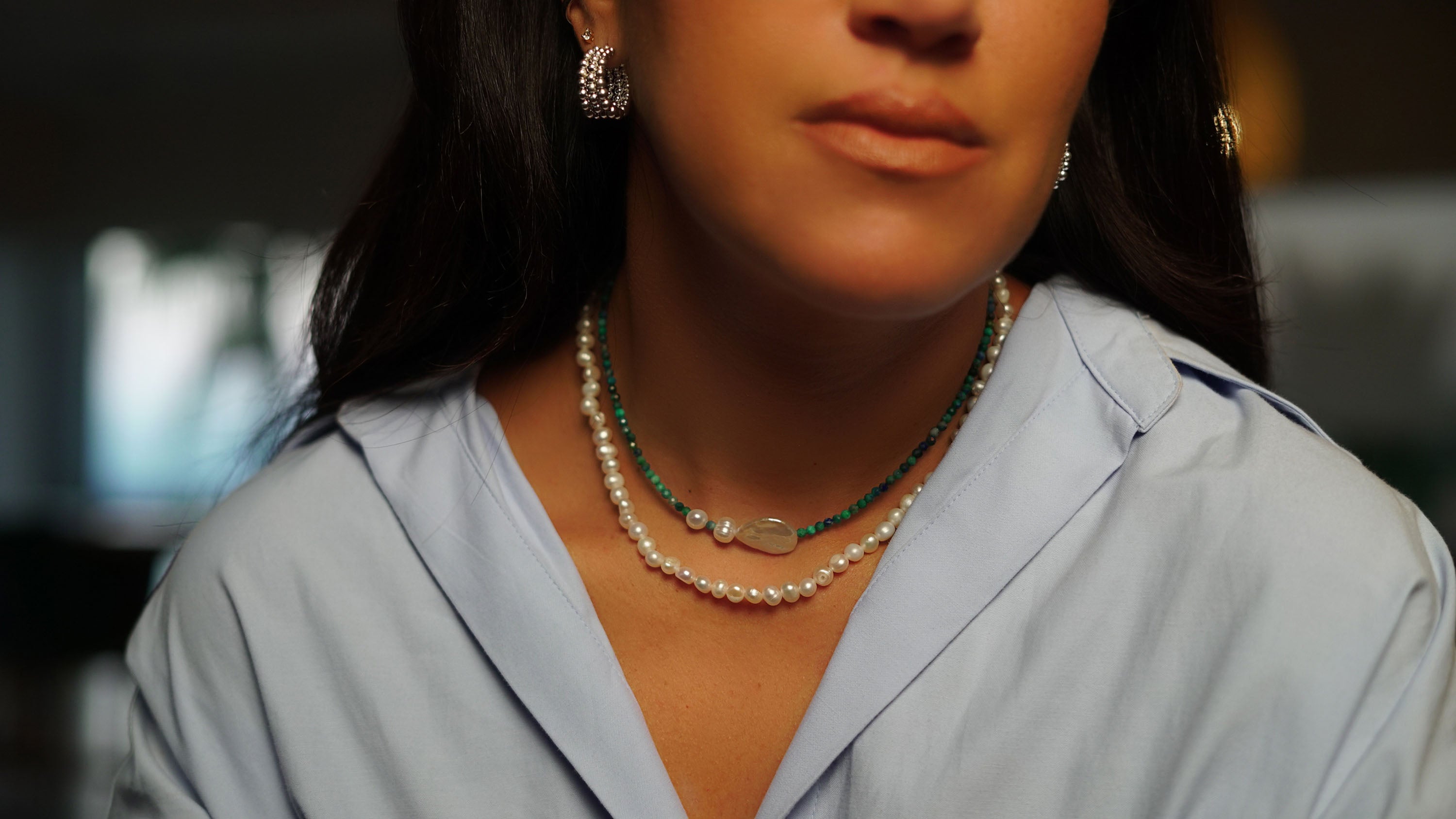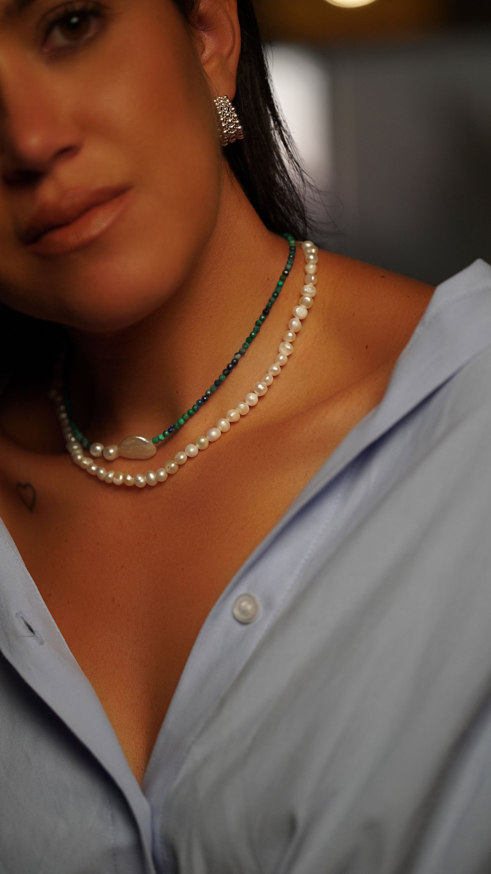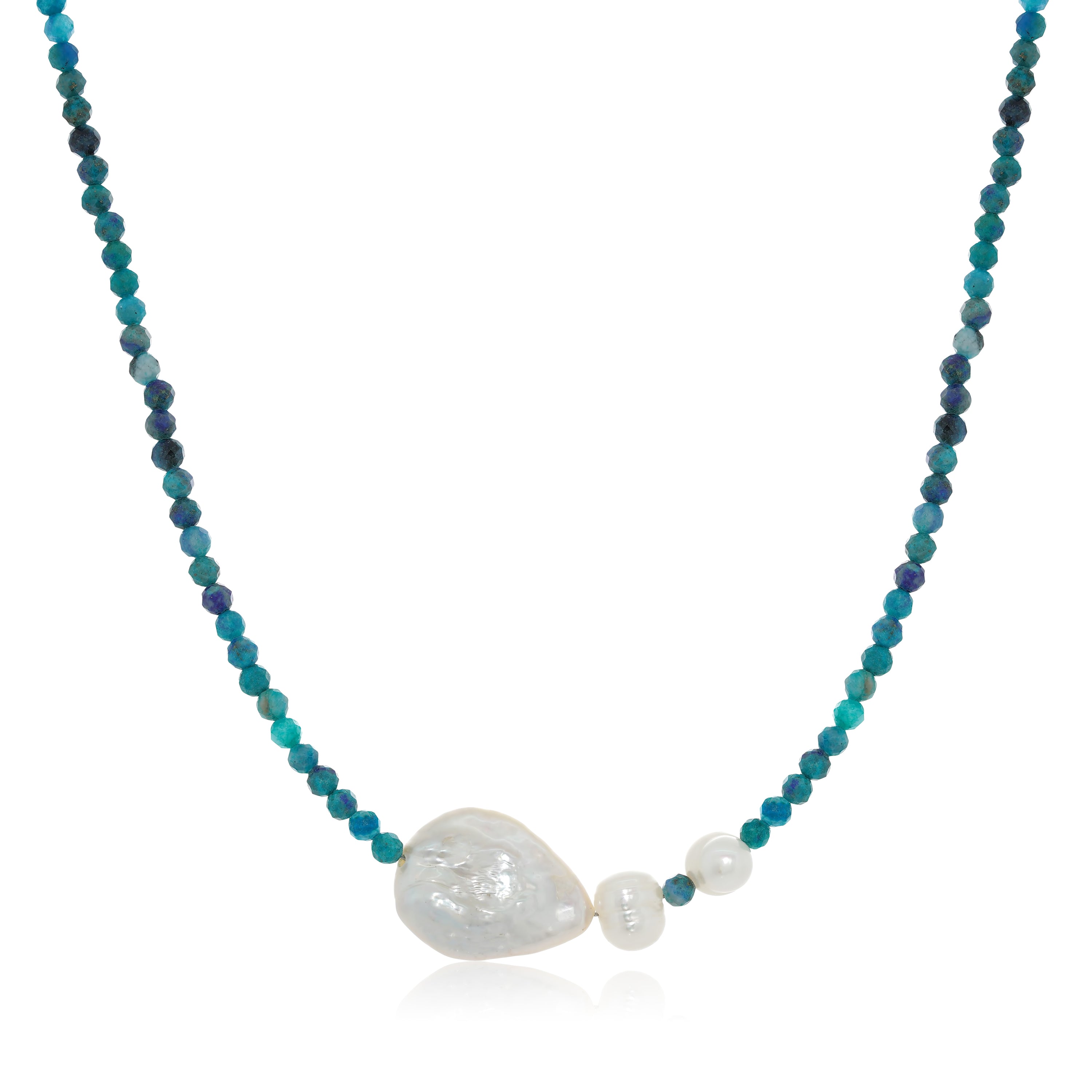 The Chrysocolla and Bio Pearl Necklace is a breathtaking piece that beautifully combines the vibrant hues of chrysocolla with the soft elegance of bio pearls. Featuring striking blue and green tones, the chrysocolla stones exhibit a mesmerizing luster that captures the light, creating an eye-catching effect. The addition of bio pearls adds a touch of sophistication and embodies the current trend of incorporating pearls into modern jewelry. Their organic shapes and natural shine complement the rich colors of the chrysocolla, resulting in a harmonious design. This necklace is perfect for making a statement, whether worn alone or layered with other pieces, effortlessly elevating any outfit while embracing the elegance and versatility of pearls in contemporary fashion.