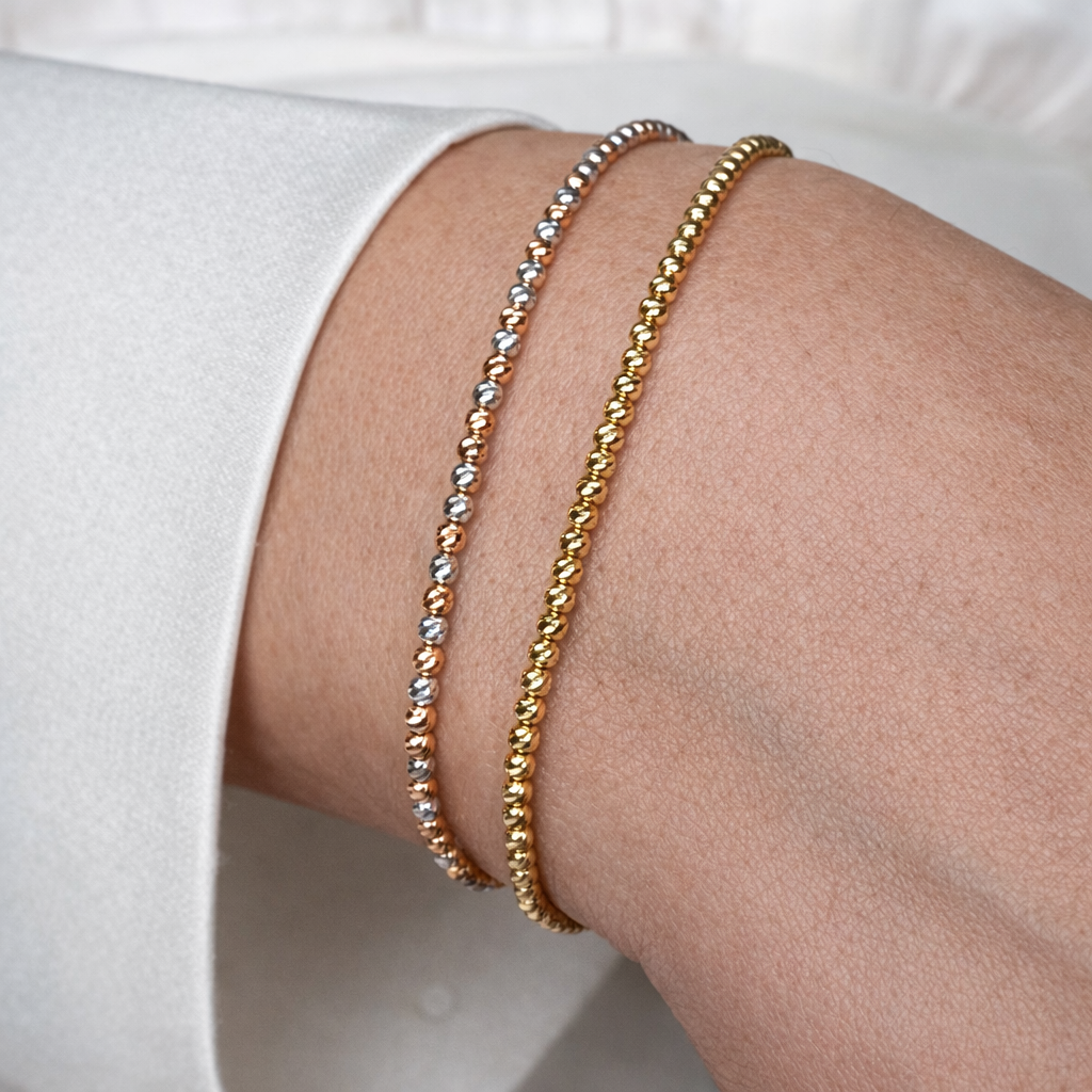 Each bead is crafted with a diamond-cut finish, a specialized jewelry technique that enhances light reflection and delivers superior sparkle. With a total gold weight of approximately 2.24 grams, this piece reflects fine craftsmanship while remaining lightweight and comfortable for everyday wear.