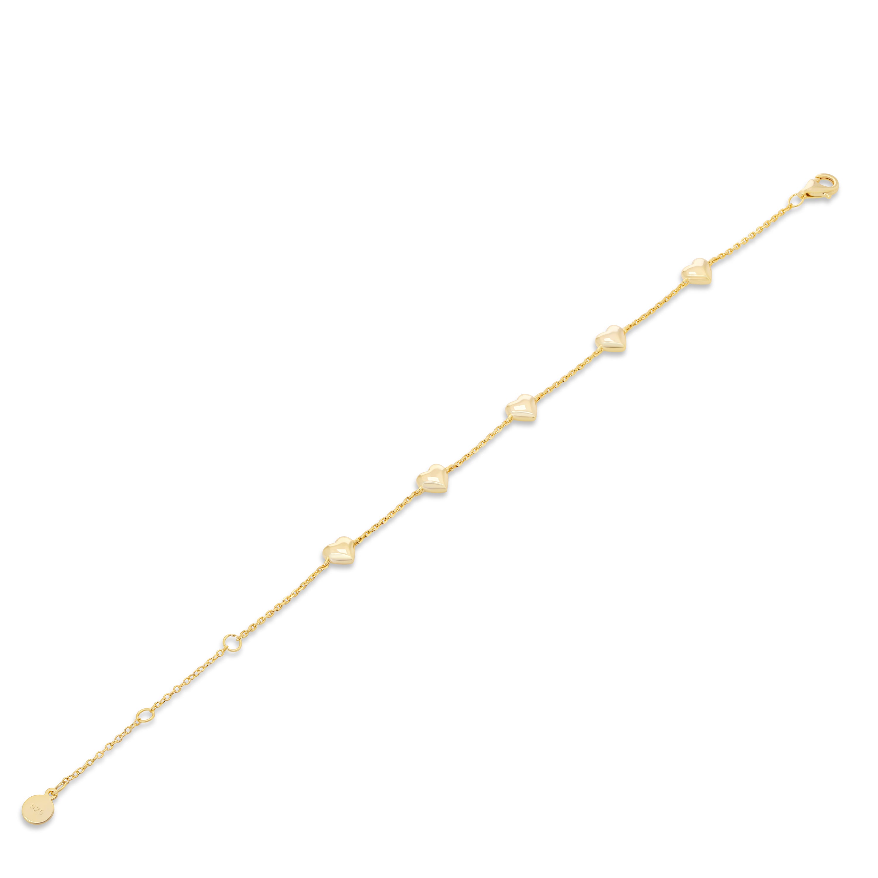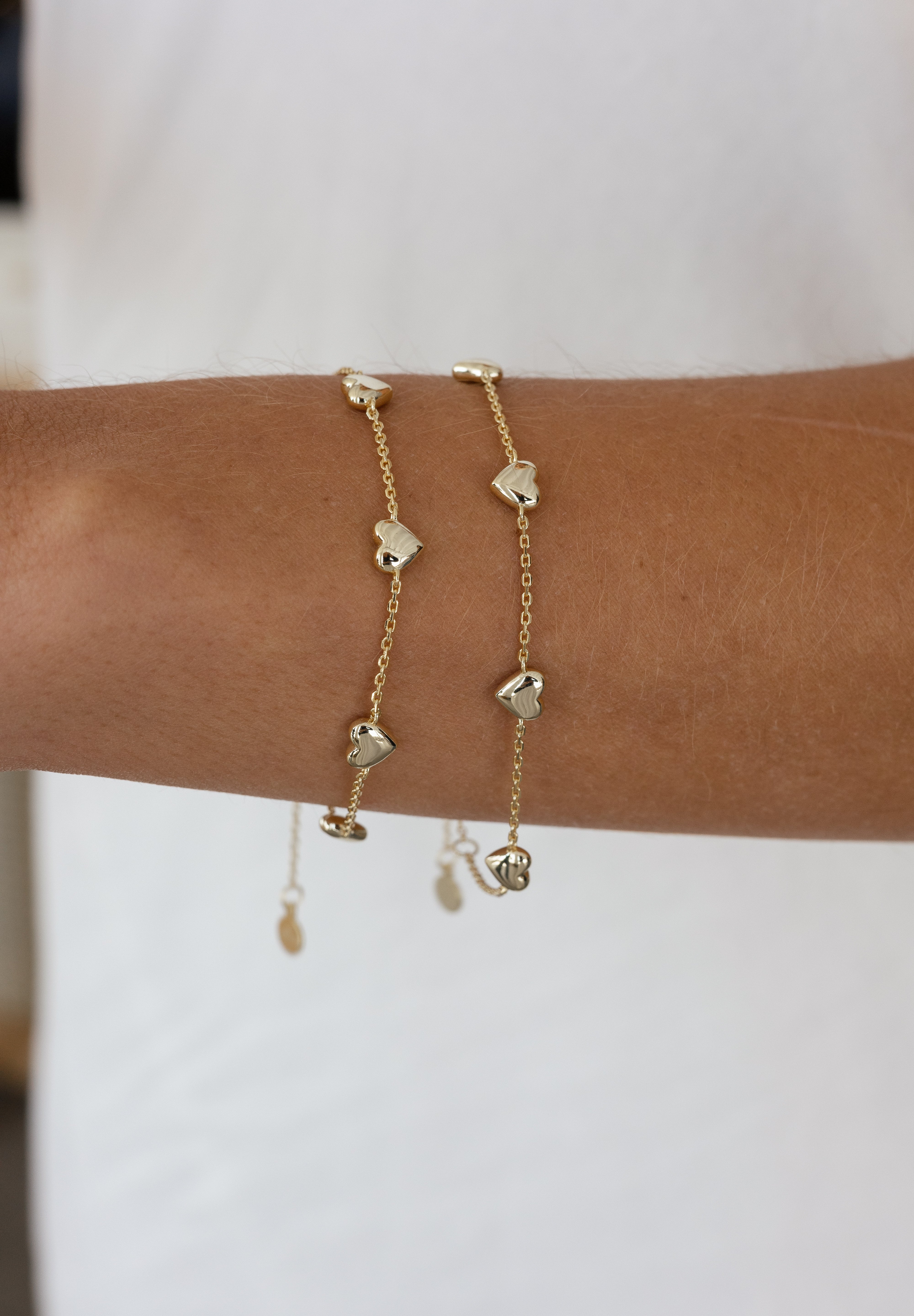 The Cali Bracelet features a delicate, thin chain with bold heart-shaped charms, crafted in gold vermeil. This piece is perfect for adding a romantic yet trendy touch to your wrist. Whether worn alone for a chic statement or layered with other bracelets, the Cali Bracelet effortlessly combines romance and minimalism, making it a versatile addition to any look.