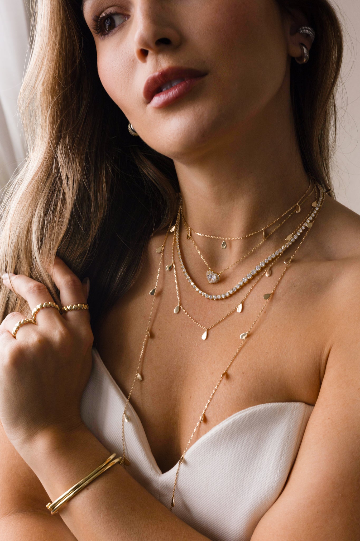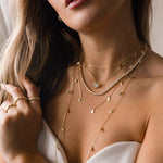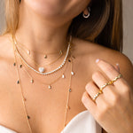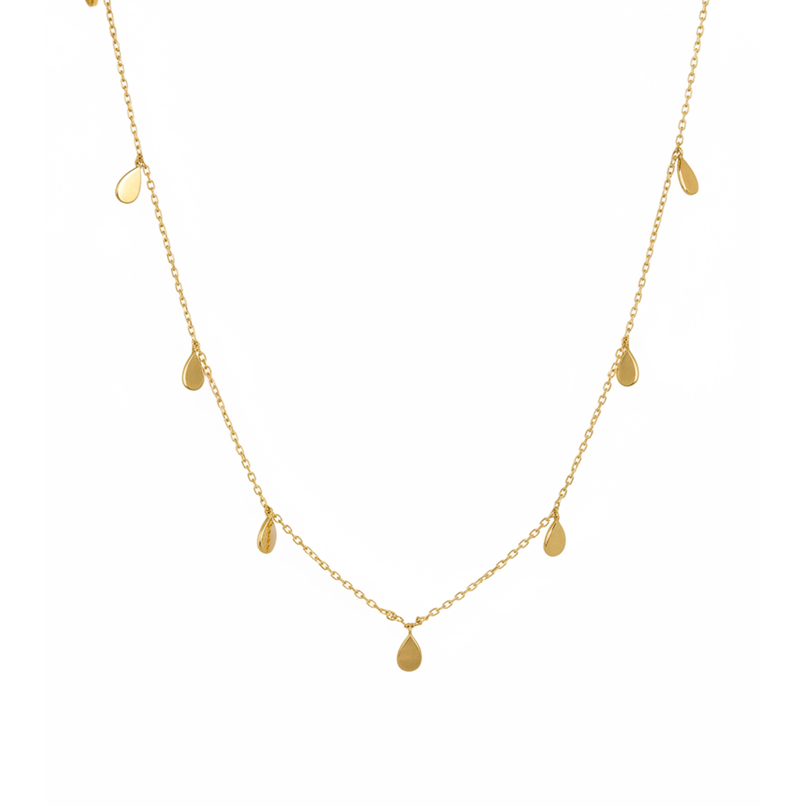 Inspired by the fluid beauty of shimmering waters, this long necklace captures the soft movement of droplets dancing under the light. Measuring 75 cm (29.5") with an additional 5 cm (2") extender, it features a sleek, polished chain that reflects light like delicate water drops — effortless, luminous, and designed for layering.