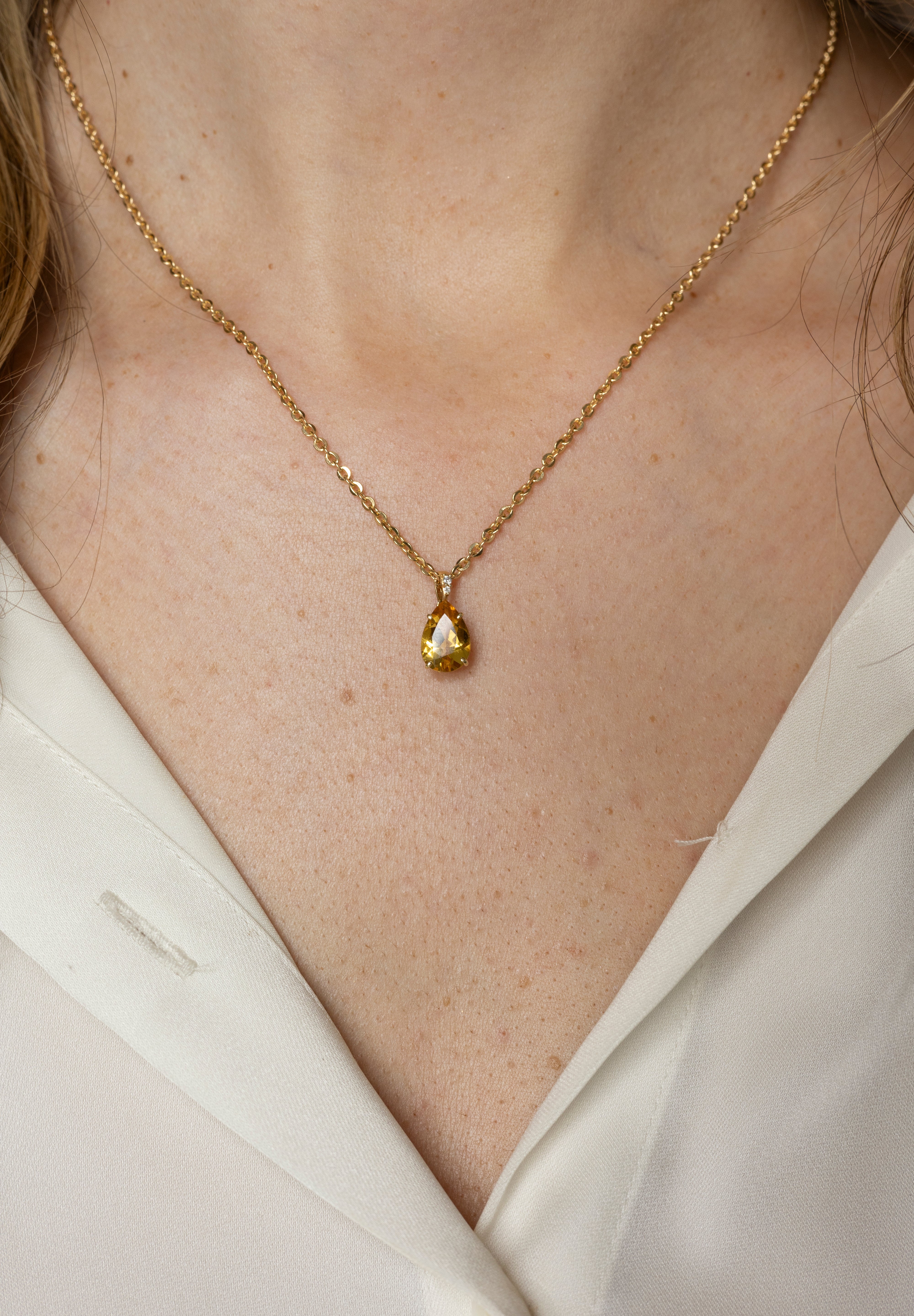 Delicate and sophisticated, the Citrine Drop Pendant in 18k Yellow Gold captures the warmth and brilliance of one of nature’s most radiant gemstones. Featuring a natural citrine sourced from Brazil—renowned for producing the world’s finest citrines—this pendant celebrates timeless elegance with a modern spirit.