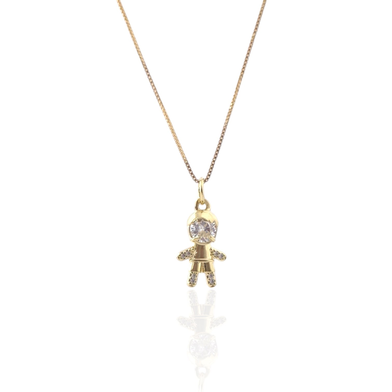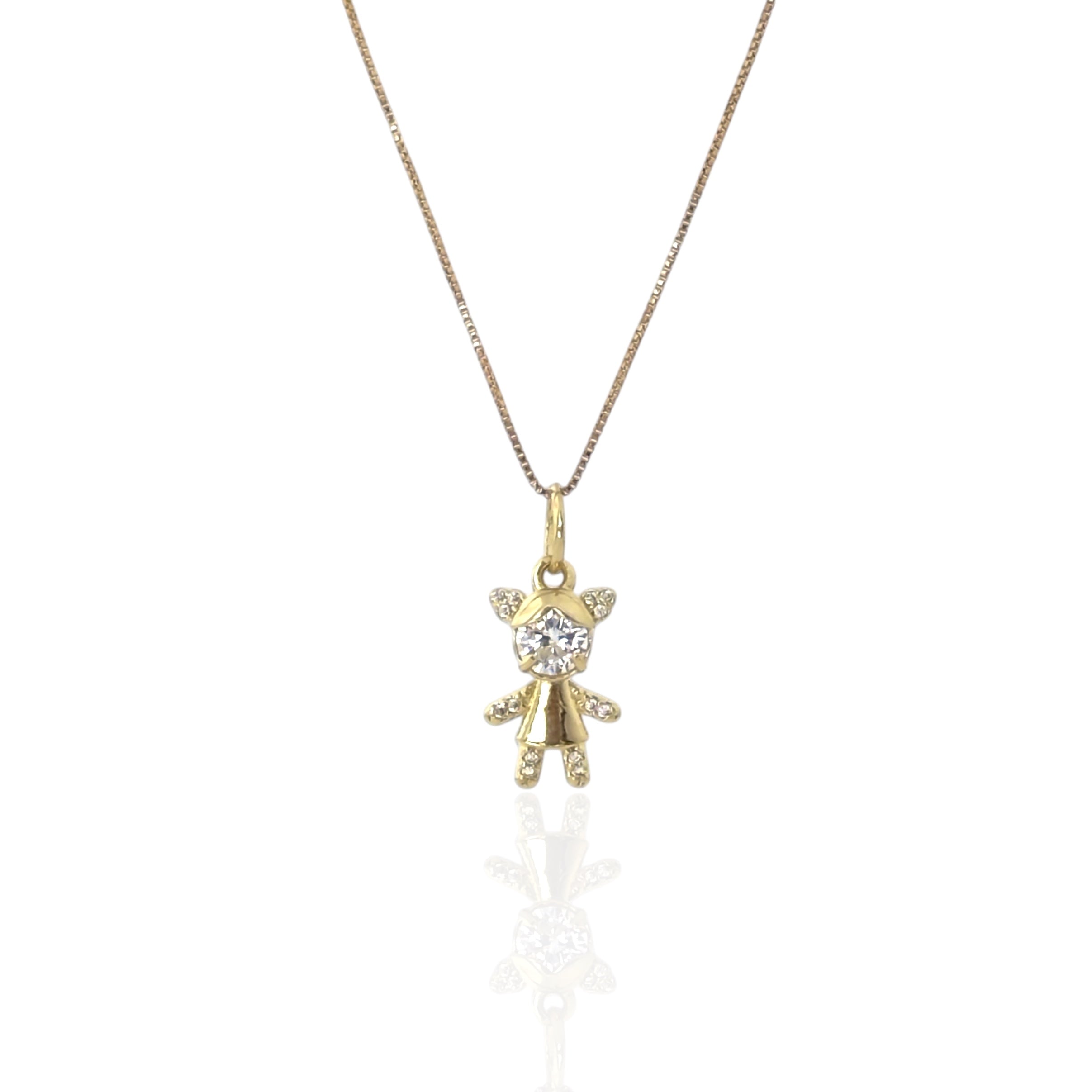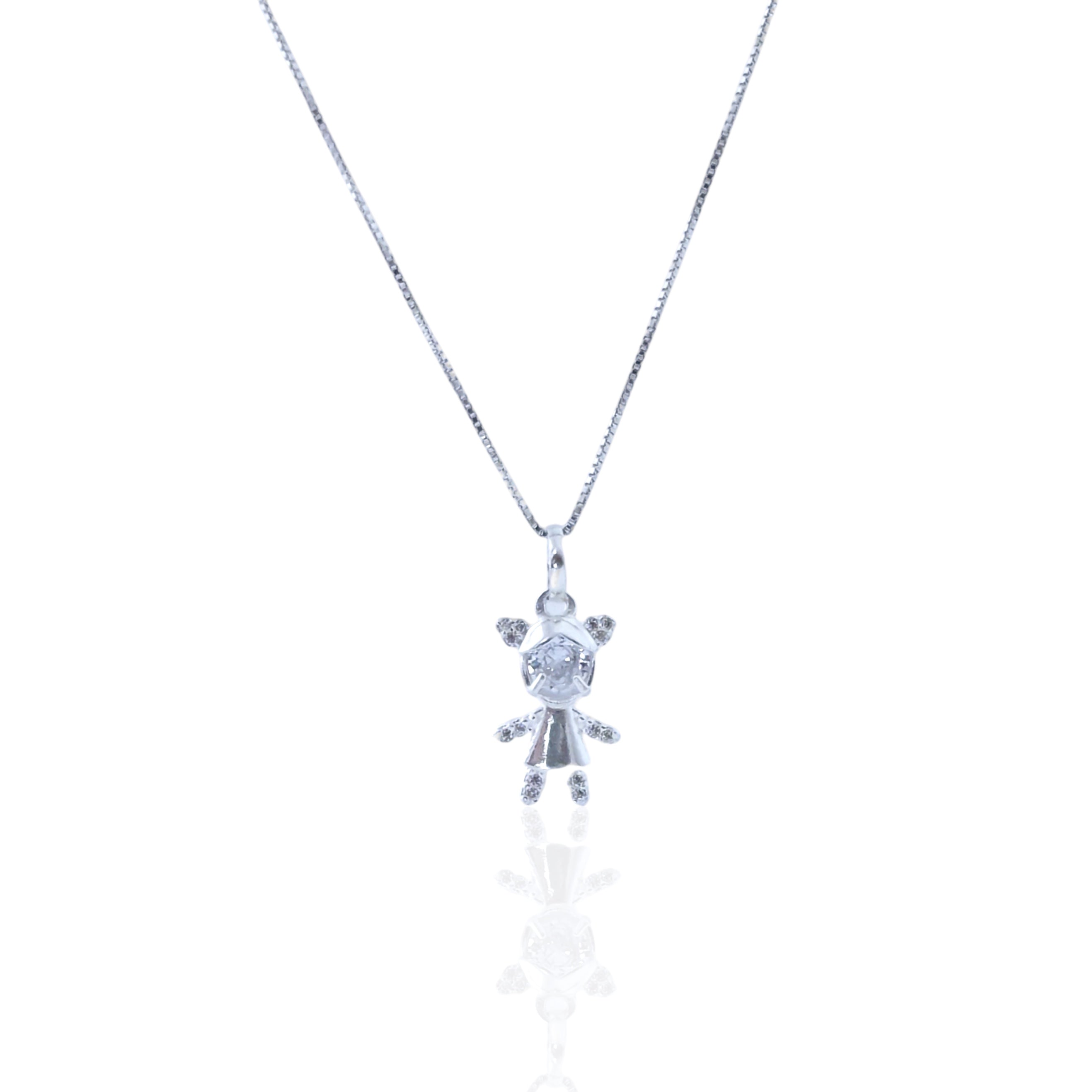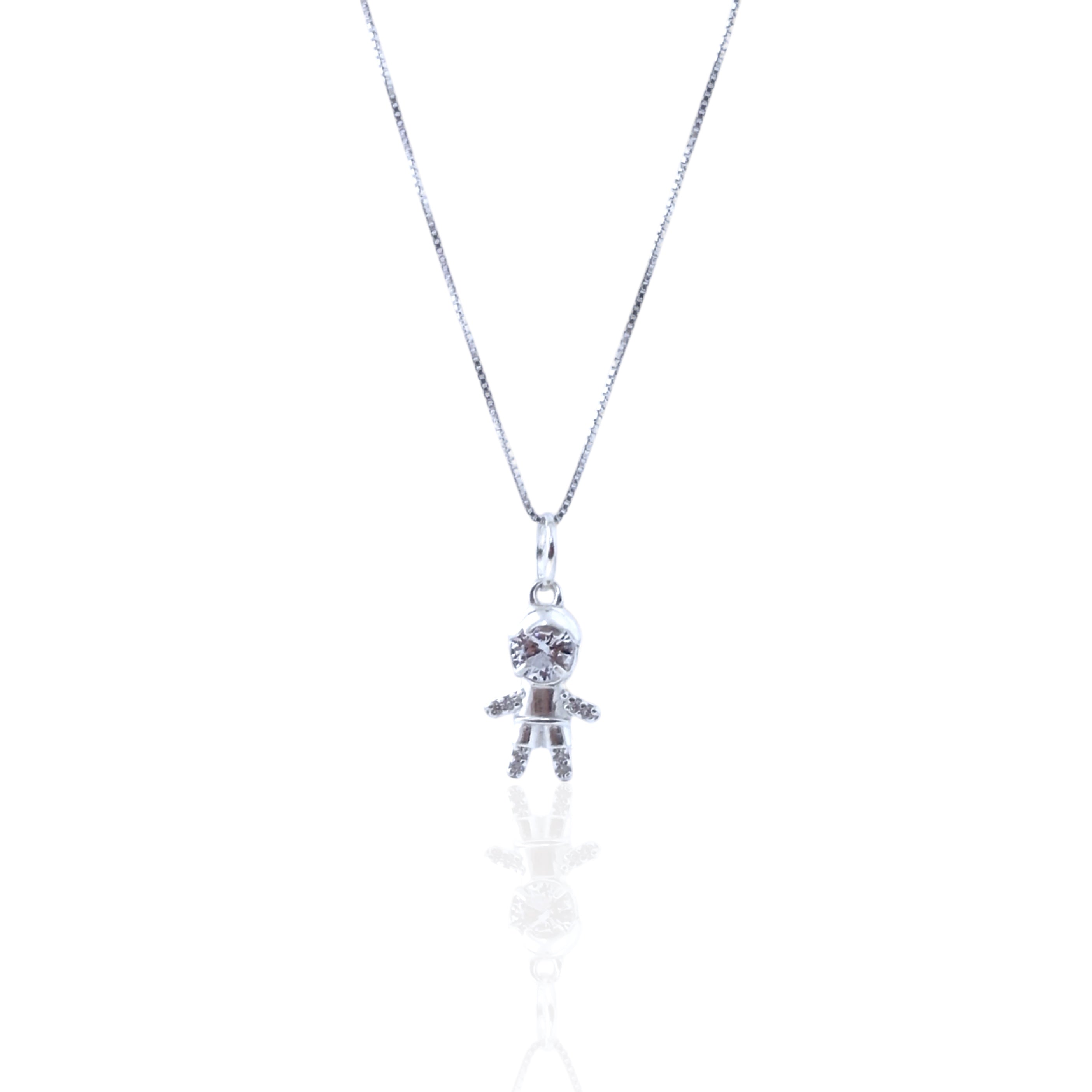Sophisticated and delicate boy or girl pendant adorned with zirconia crystals on a box chain.