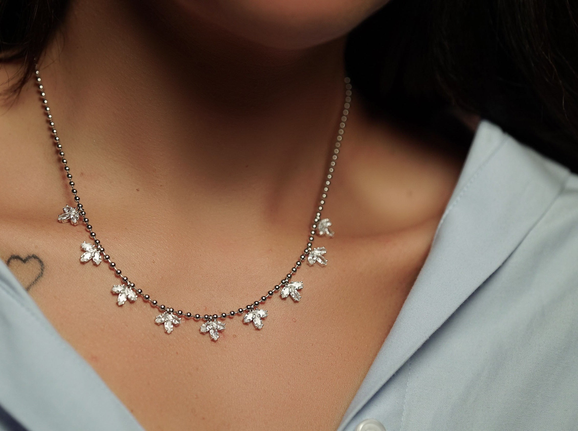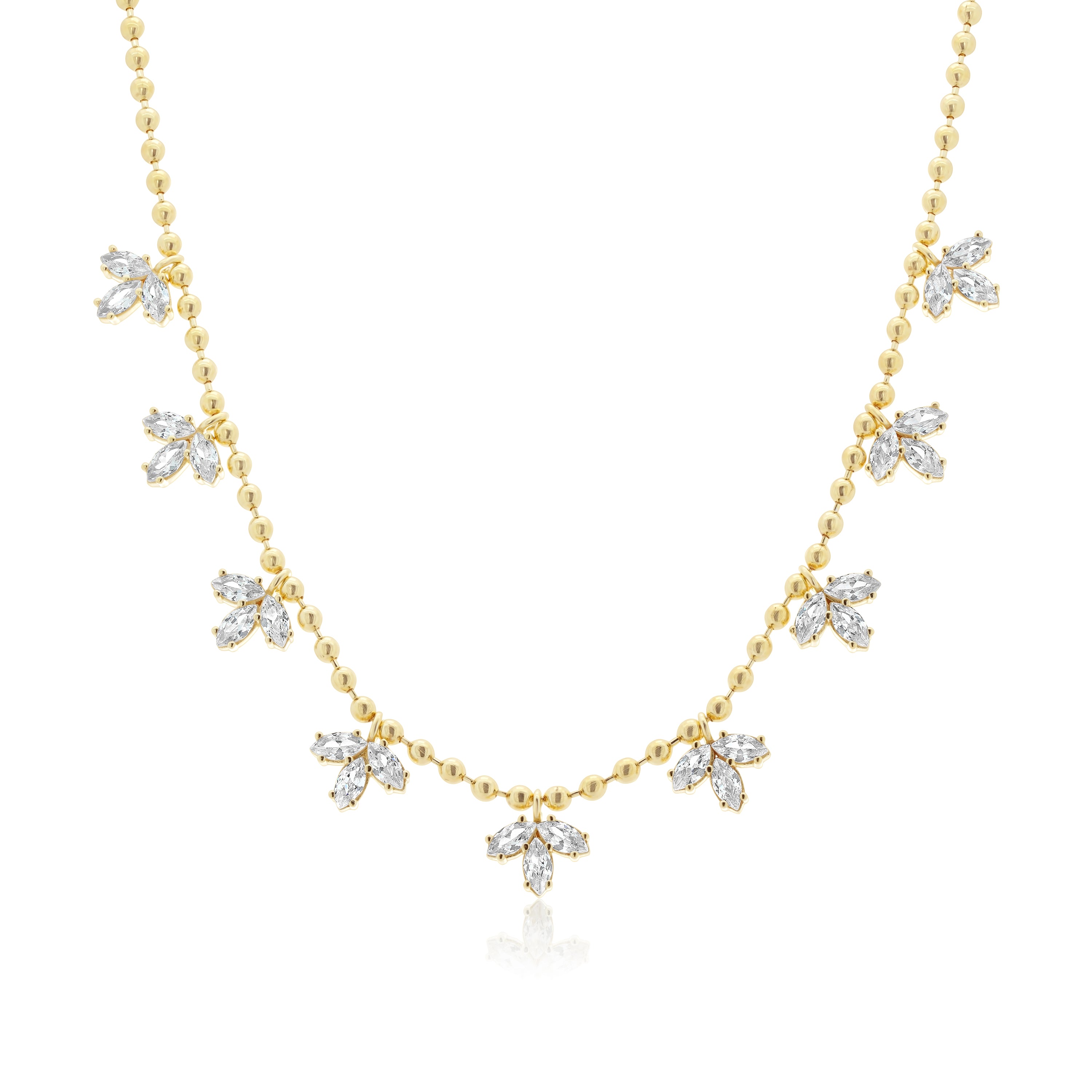 The Marquise Leaf Dangle Necklace is a beautifully crafted piece that captures the essence of nature in a sophisticated design. Featuring elegant marquise-shaped leaves that gracefully dangle, this necklace adds a touch of whimsy and femininity to any outfit. The necklace is complemented by a delicate bead chain, which enhances its charm and provides a subtle sparkle. Perfect for layering or wearing on its own, the Marquise Leaf Dangle Necklace is ideal for both casual outings and special occasions, making it a versatile addition to your jewelry collection. Its enchanting design brings a fresh and stylish touch to your look.
