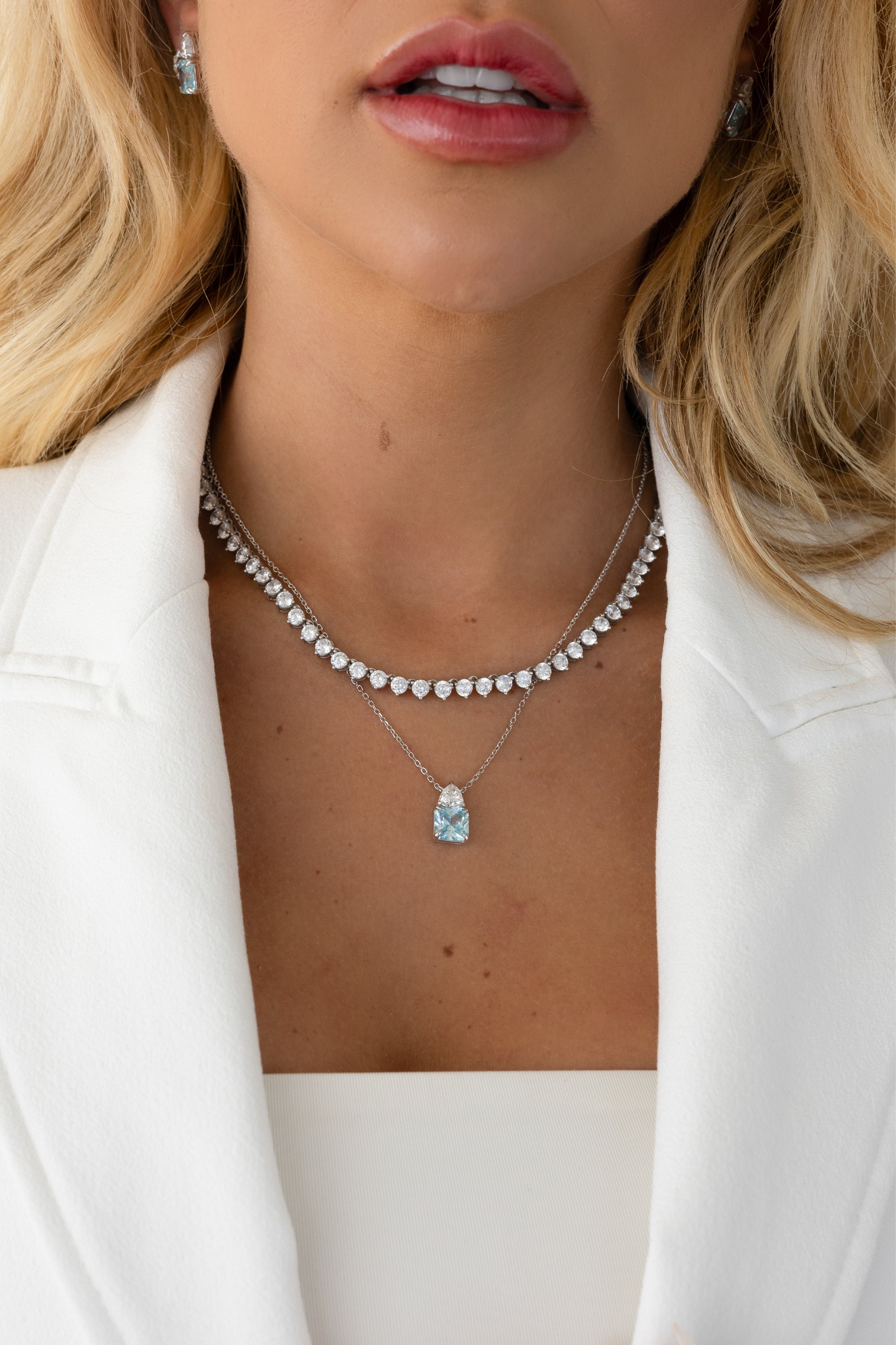 The Lume Necklace features a captivating Aquamarine Zirconia stone and dazzling Moissanite accents. Elegant and versatile, it adds a touch of luxury to any look, bringing personality and sparkle to both everyday moments and special occasions.