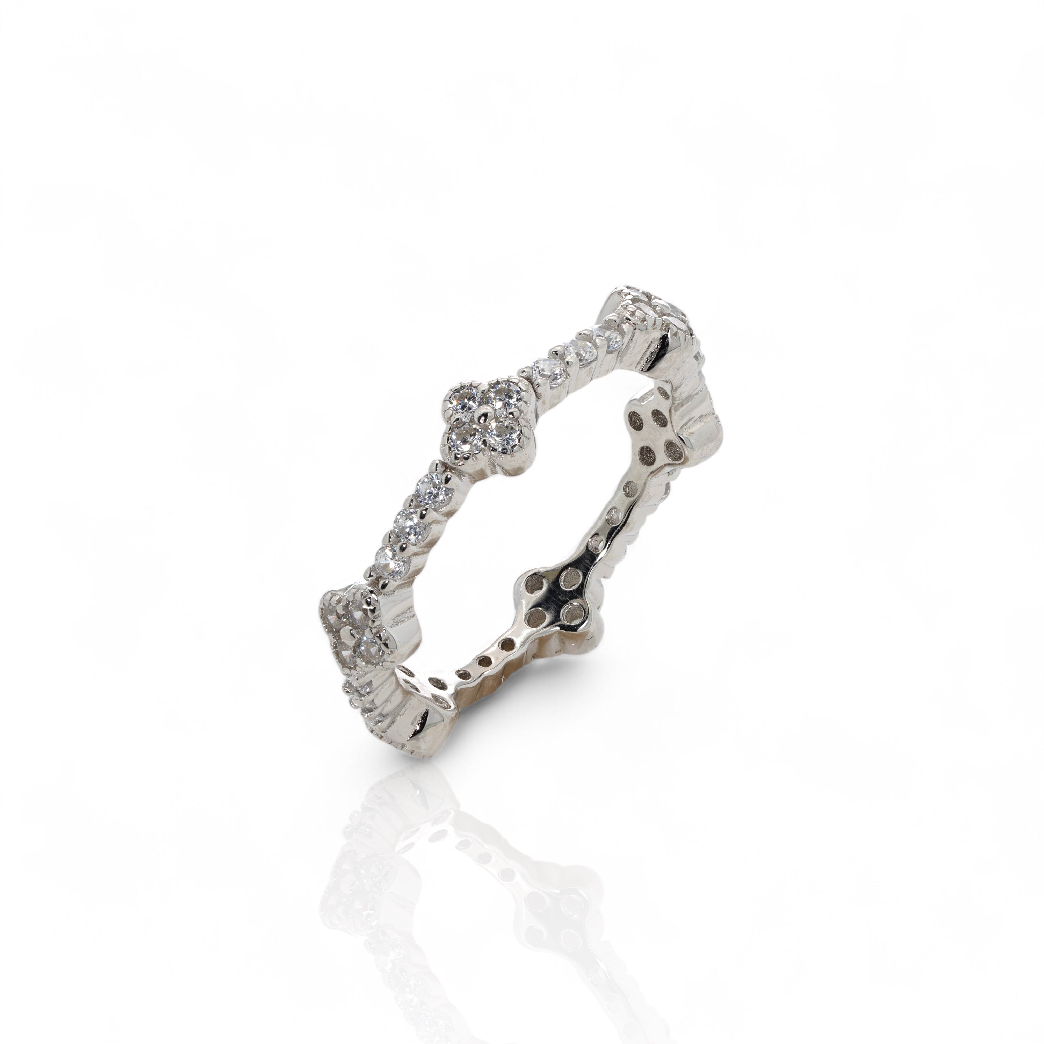 Delicate, refined, and timeless — the Catarine Band Ring is a true symbol of elegance. This slender band features intricate micro-pavé cubic zirconia along its entire contour, while delicate mini floral motifs, inspired by the iconic Catarine design, add a touch of charm and sophistication. Available in gold and silver, this dainty yet striking ring is perfect for stacking, gifting, or wearing as a subtle statement of grace. Pair it with the Catarine earrings, necklace, or ring for a perfectly coordinated look.